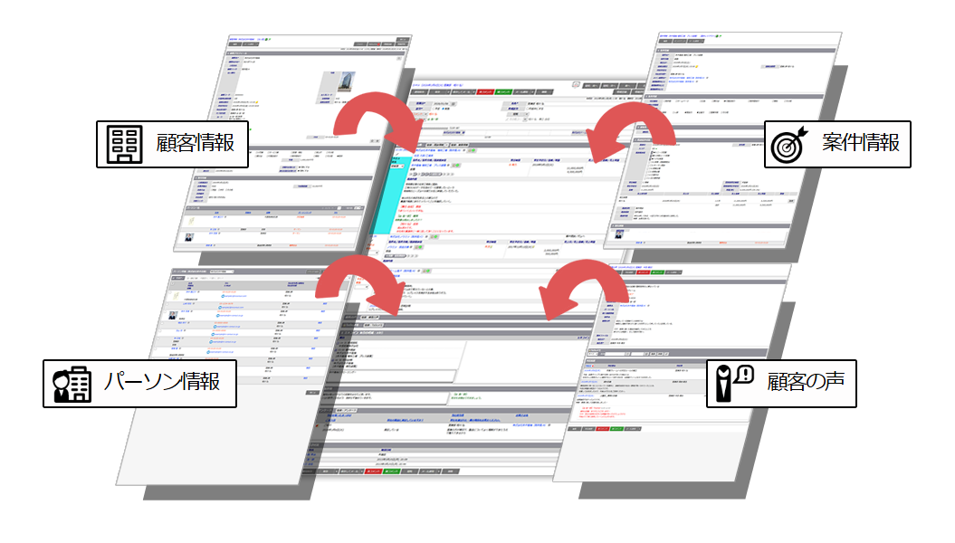 顧客・パーソン間の人的つながりと営業活動の見える化に欠かせない三種の神器、『カスタマーシート』『コンタクトマップ』『リレーションマップ』を使うことで、顧客・パーソン間の人的つながりを一目で見える化、把握・管理できるので、顧客同士の関係や紹介などがキーとなる営業シーンで有効に機能します。