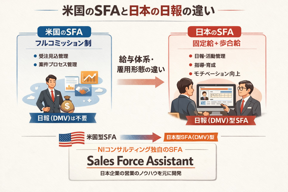 NIコンサルティングのSFA「Sales Force Assistant」は、米国のSFAを日本用にローカライズしたものではなく、紙の日報時代から培ってきた日本企業の営業指導ノウハウを元に開発された独自SFAです。