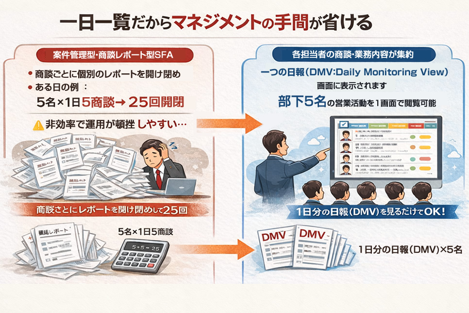 日報(DMV)画面のない、案件管理型、商談レポート型のSFAの場合には、商談ごとにレポートを開いたり閉じたりしなければならず、オペレーションがとても煩雑になります。たとえば、5名の部下がいて、一日に5商談していたとすると、5×5=25回、レポートを開け閉めしなければならなくなり、実際にはそんな面倒なことをするマネージャーはほとんどいませんから、結局、書いても読まれない商談レポートの山を築くことになります。読まれもしないレポートを書く人はいませんから、運用頓挫につながりやすくなります。